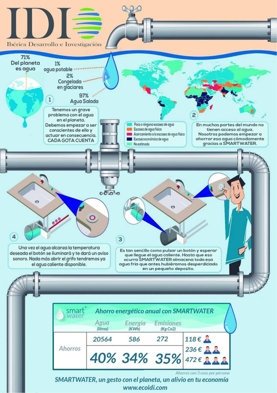 En IDI, valoramos cada gota de agua. Nuestra solución SmartWater está diseñada para optimizar el uso del agua caliente, eliminando el desperdicio y reduciendo significativamente el consumo de energía y la huella de carbono. 🚿📱💧